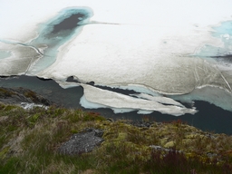 hinab und dort unten liegen Gletscherseen, die zum großen Teil noch mit Eis