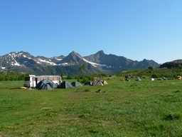 ist ein großer Teil des Platzes von vielen Zelten und einem Bus