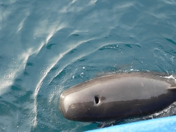 sich eine Schule Grindwale dem Schiff und schwimmt neben uns her.